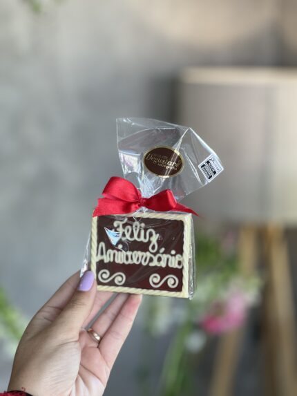 Um tablete de chocolate Degustare com a frase de feliz aniversario
