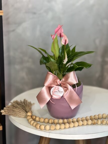 Um anturio Lili cor de rosa em um cachepo rosa de ceramica