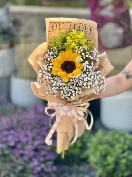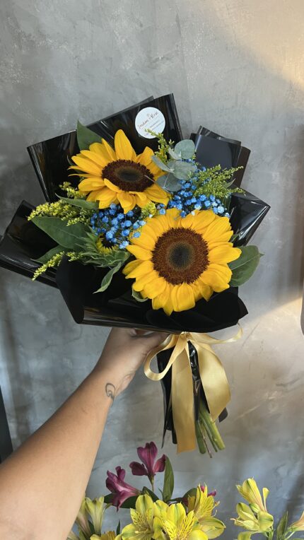 Um buquê com 5 girassóis acompanhados de ruscos e mosquitinho. ATENÇÃO: Cada buquê é único, feito de forma manual pensado
