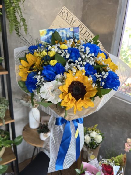 Um buquê inspirado na obra de Van gogh, com dois girassóis e uma rosa amarela acompanhados de flores azuis. ATENÇÃO: