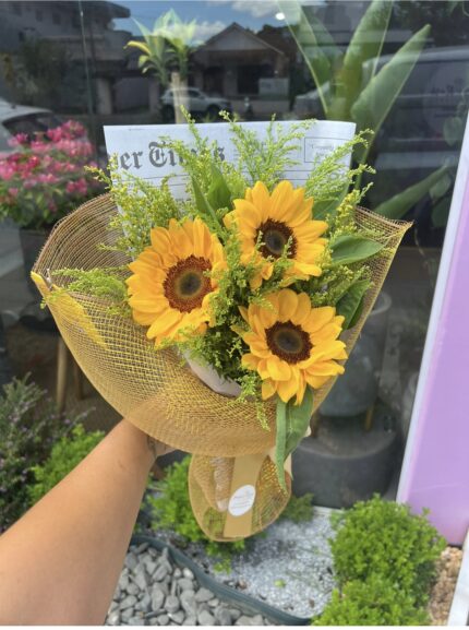 Um buquê com três girassóis embalados em uma tela dourada. ATENÇÃO: Cada buquê é único, feito de forma manual pensado