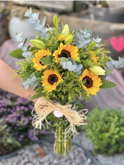 Um buquê com 10 girassóis acompanhado de lírio, tango e eucalipto. Sem papel na embalagem, somente um belo laço de