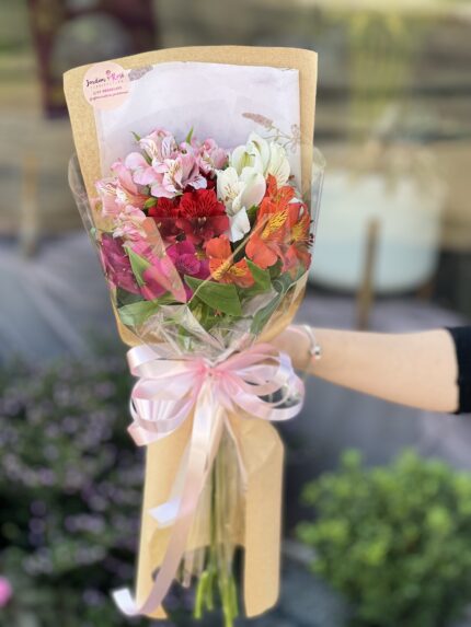 Um buquê com astroemerias sortidas coloridas. ATENÇÃO: Cada buquê é único, feito de forma manual pensado para cada momento, podendo