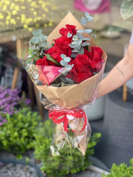 Um buquê com 5 rosas vermelhas importadas  acompanhadas de ruscos e eucalipto. ATENÇÃO: Cada buquê é único, feito de forma