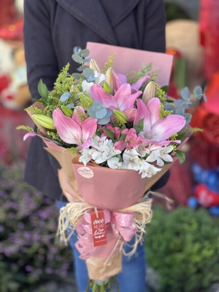 Um buquê com lírios cor de rosa e astromelias brancas acompanhados de tango e eucalipto. ATENÇÃO: Cada buquê é único,