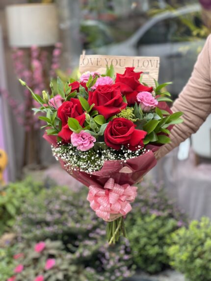 Um buquê com rosas vermelhas e lisianthus cor de rosa. ATENÇÃO: Cada buquê é único, feito de forma manual pensado