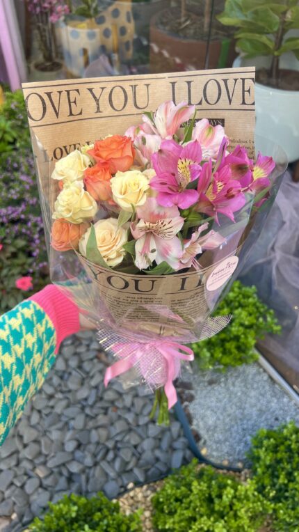 Um buquê de flores mistas selecionadas embalado em uma tela cor de rosa. ATENÇÃO: Cada buquê é único, feito de