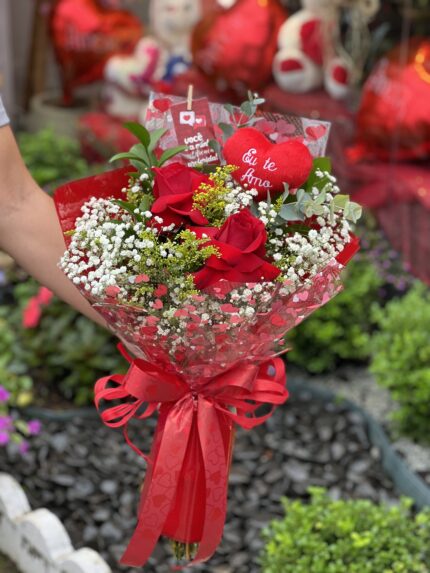 Um buquê com duas rosas decoradas acompanhadas de eucalipto, ruscos, tango, mosquitinho e pelucia de coração. ATENÇÃO: Cada buquê é