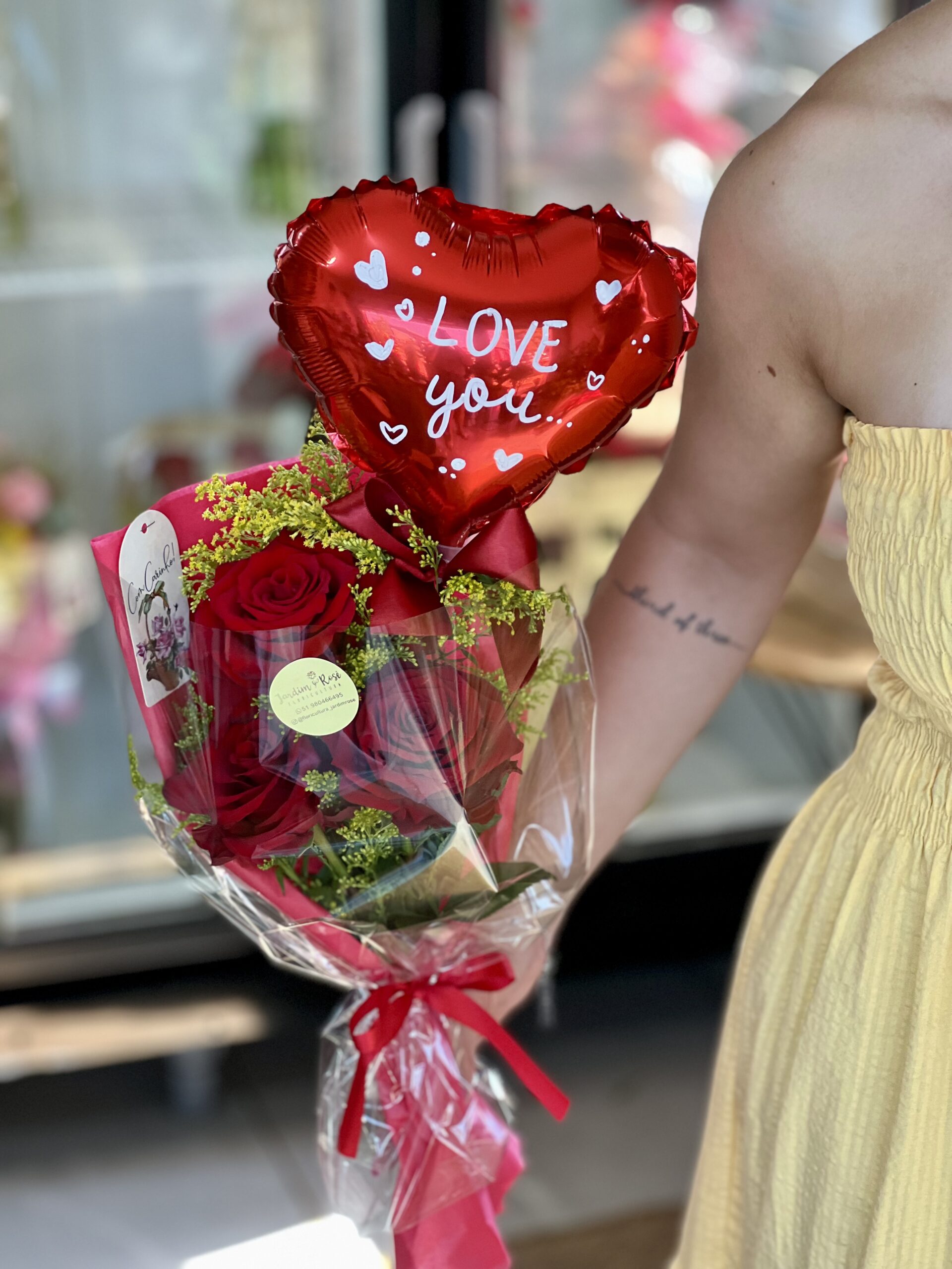 Um belo buquê com 3 rosas importadas selecionadas + balão AMO VOCÊ