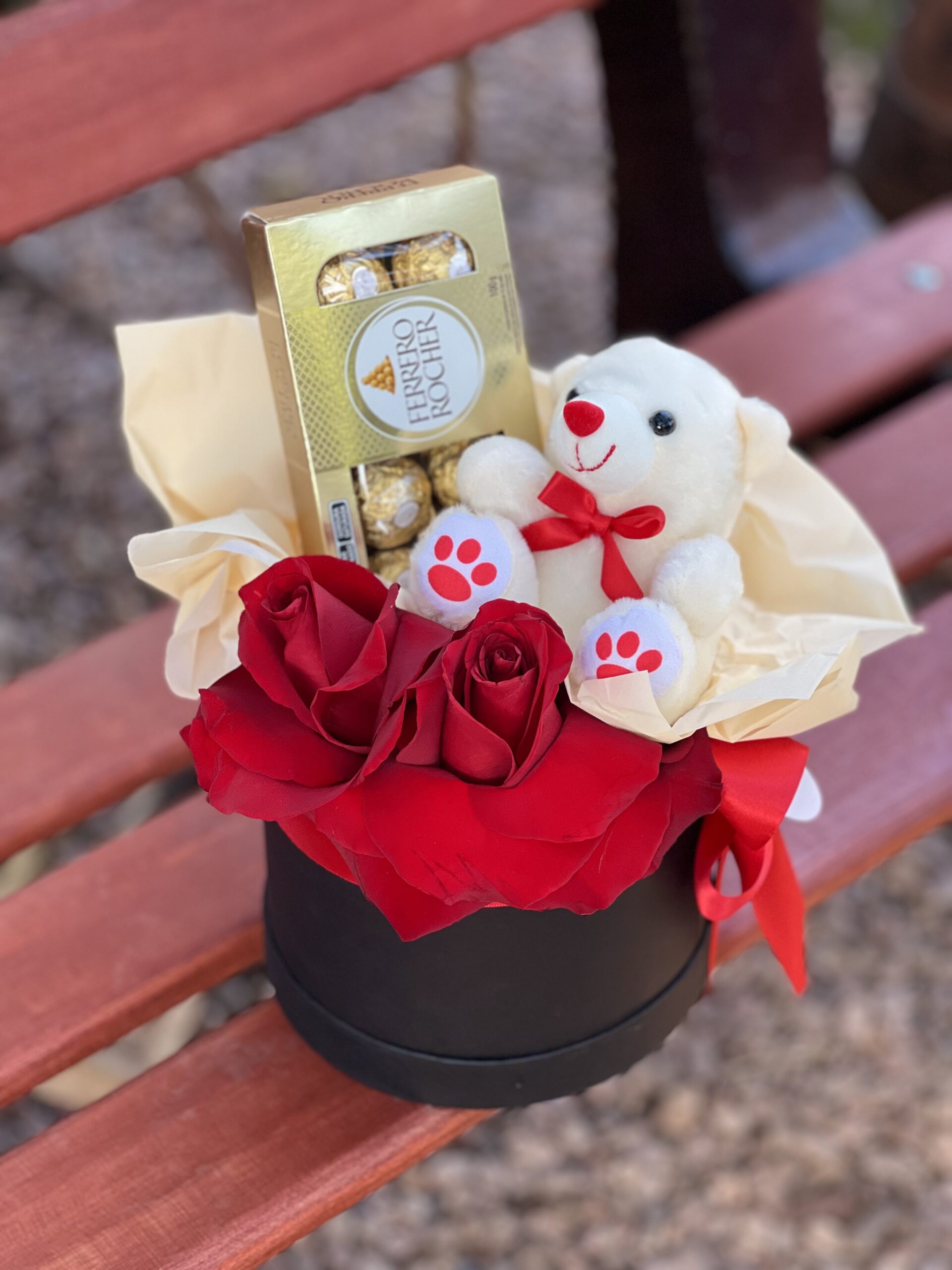 Uma linda box com rosas importadas, pelúcia e caixa de bombons Ferrero