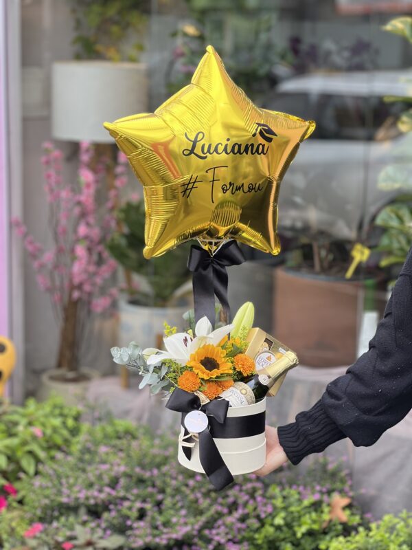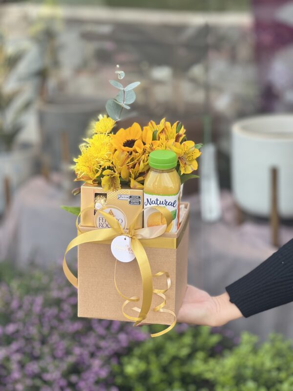 Uma box de lírios e astroemerias. ATENÇÃO: Cada buquê é único, feito de forma manual pensado para cada momento, podendo haver alteração no aspecto das flores e da embalagem.