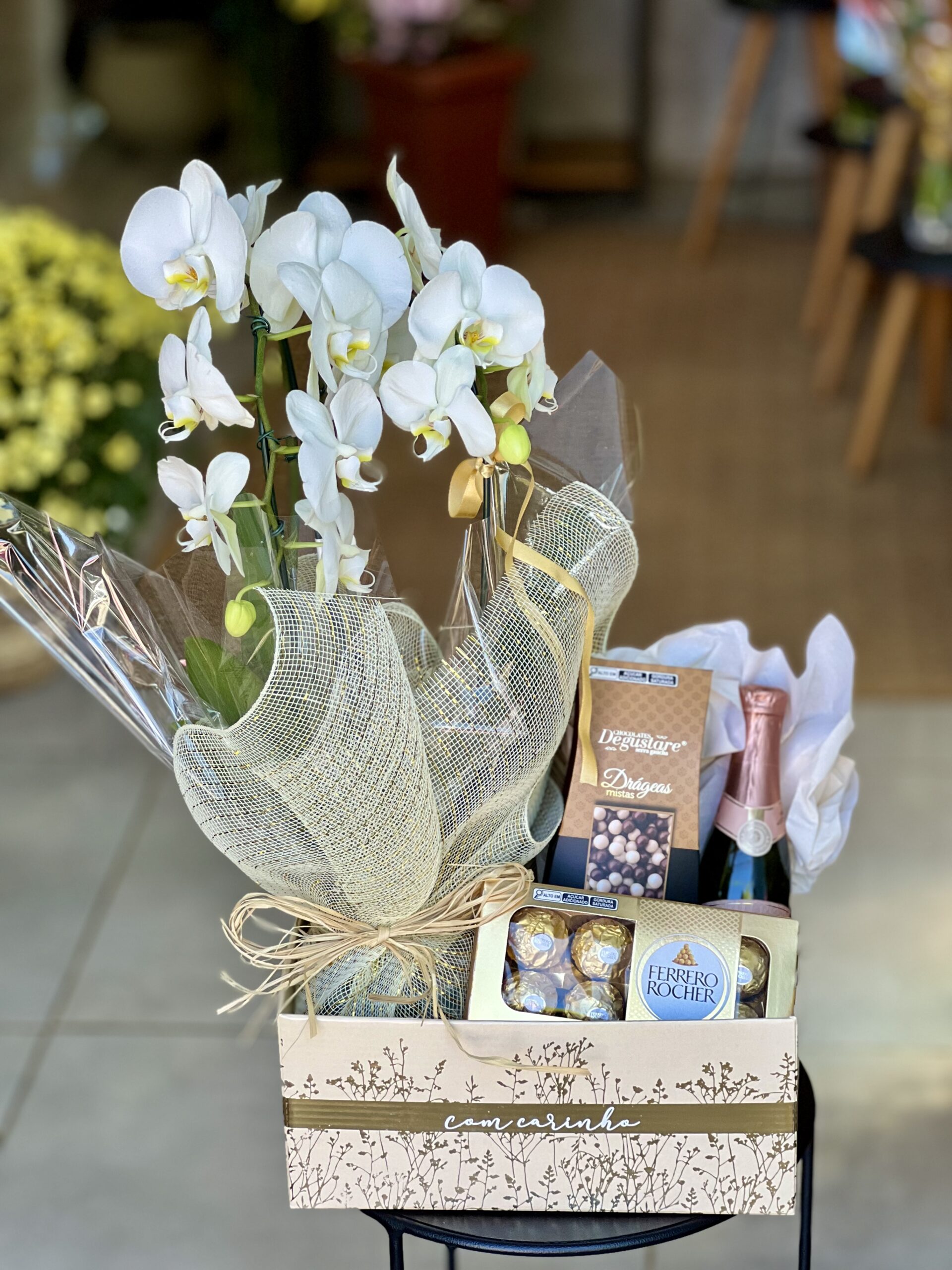 Orquídea cascata branca em uma linda embalagem decorativa, acompanhada de chocolates e mini espumante