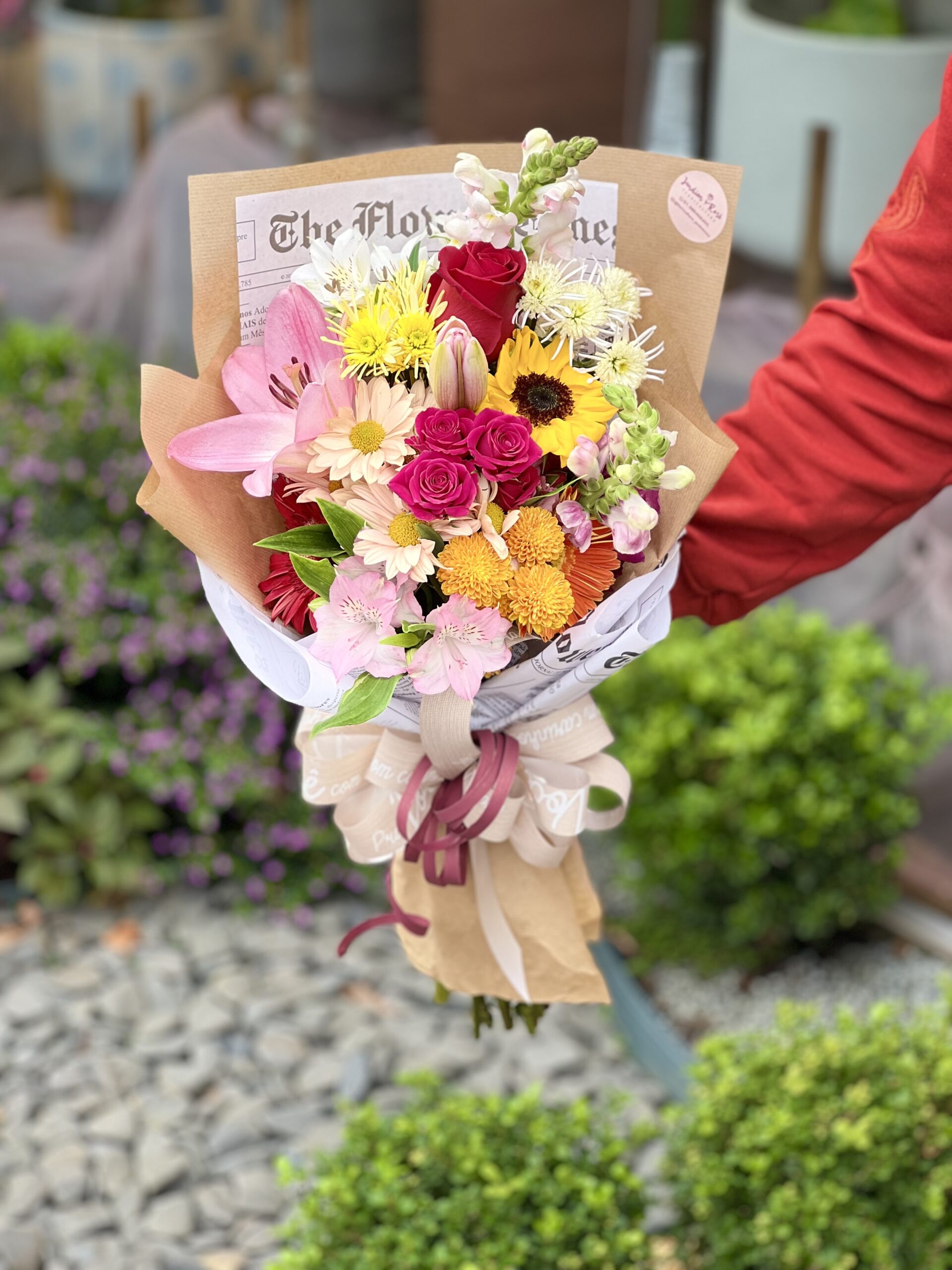 Um buquê com flores mistas com cores vivas e alegres com uma embalagem que realça as cores alegres das flores. ATENÇÃO: Cada buquê é único, feito de forma manual pensado para cada momento, podendo haver alteração no aspecto das flores e da embalagem.
