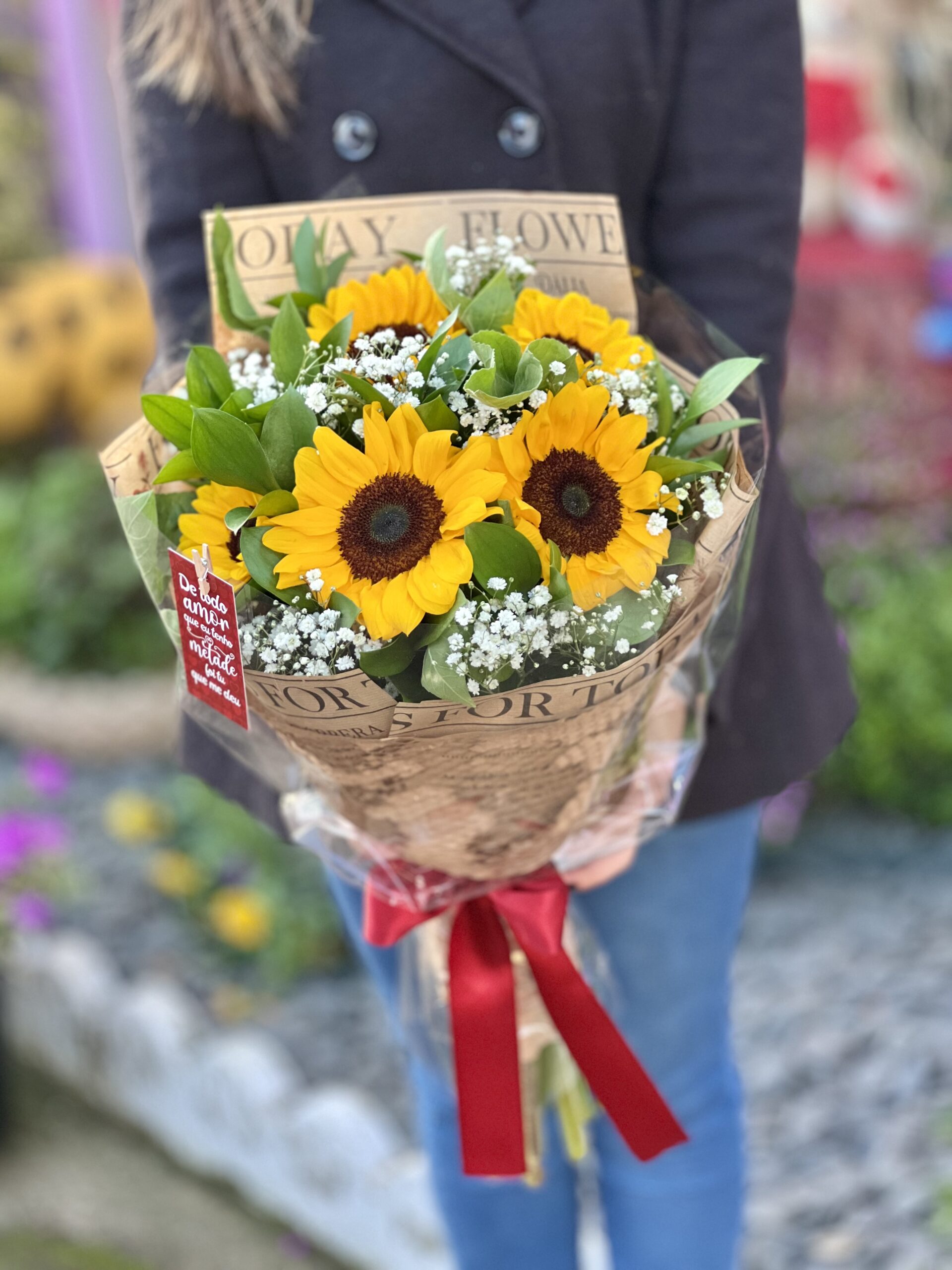 Um buquê com 5 girassóis acompanhados de ruscos e mosquitinho. ATENÇÃO: Cada buquê é único, feito de forma manual pensado para cada momento, podendo haver alteração no aspecto das flores e da embalagem.