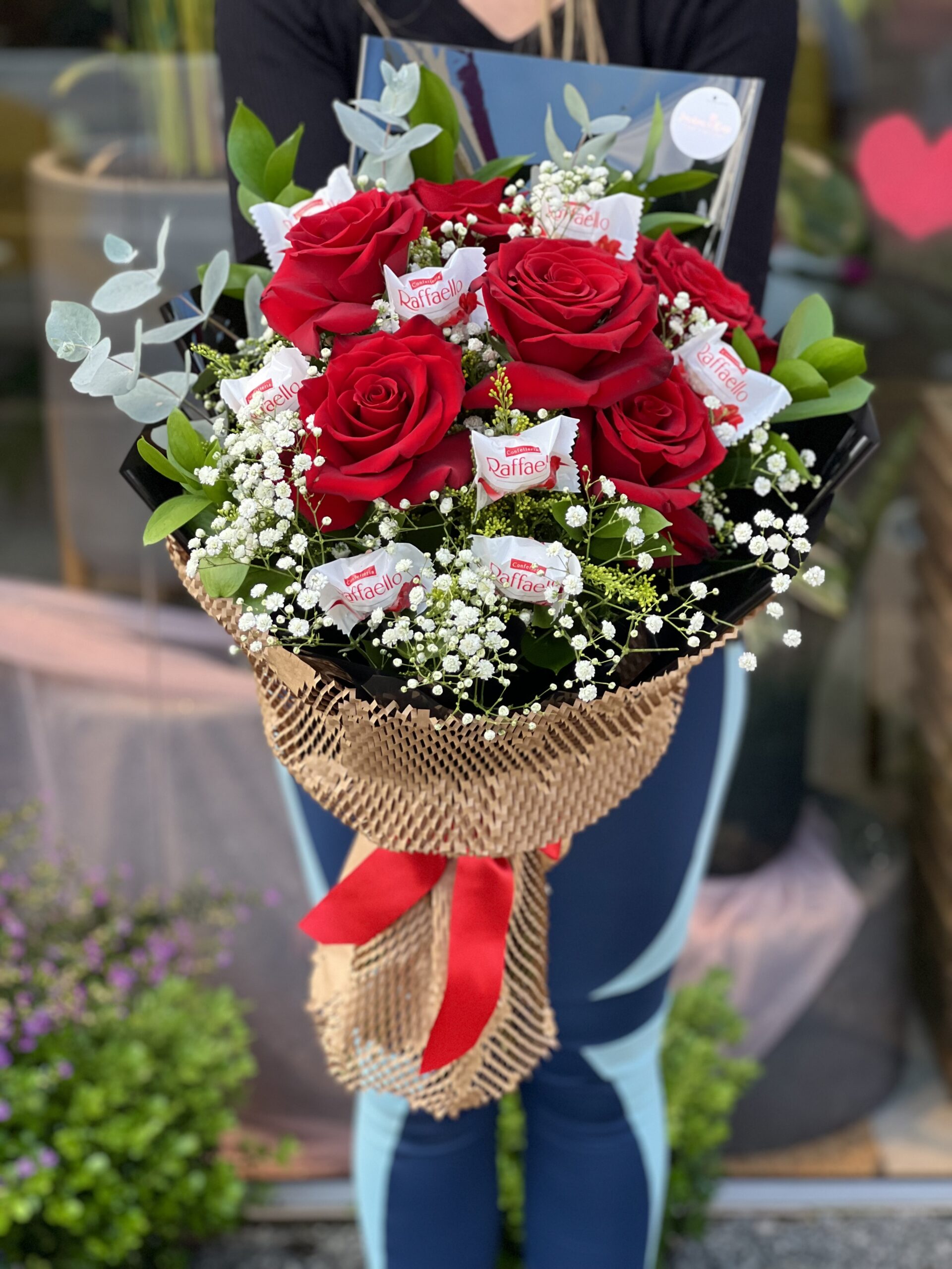 Um buquê com 6 rosas acompanhadas de ruscos, mosquitinho e Raffaellos. ATENÇÃO: Cada buquê é único, feito de forma manual pensado para cada momento, podendo haver alteração no aspecto das flores e da embalagem.