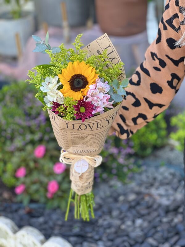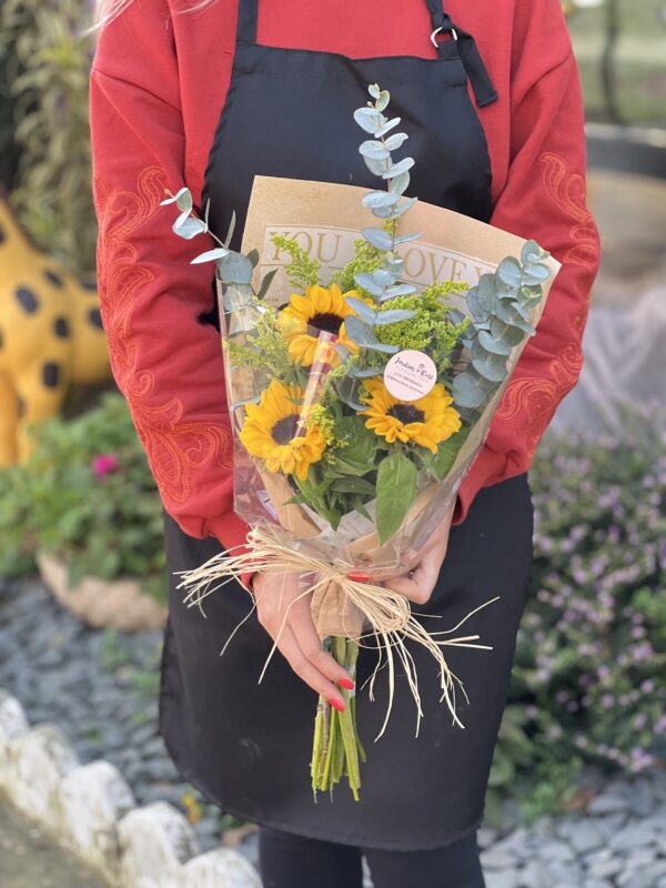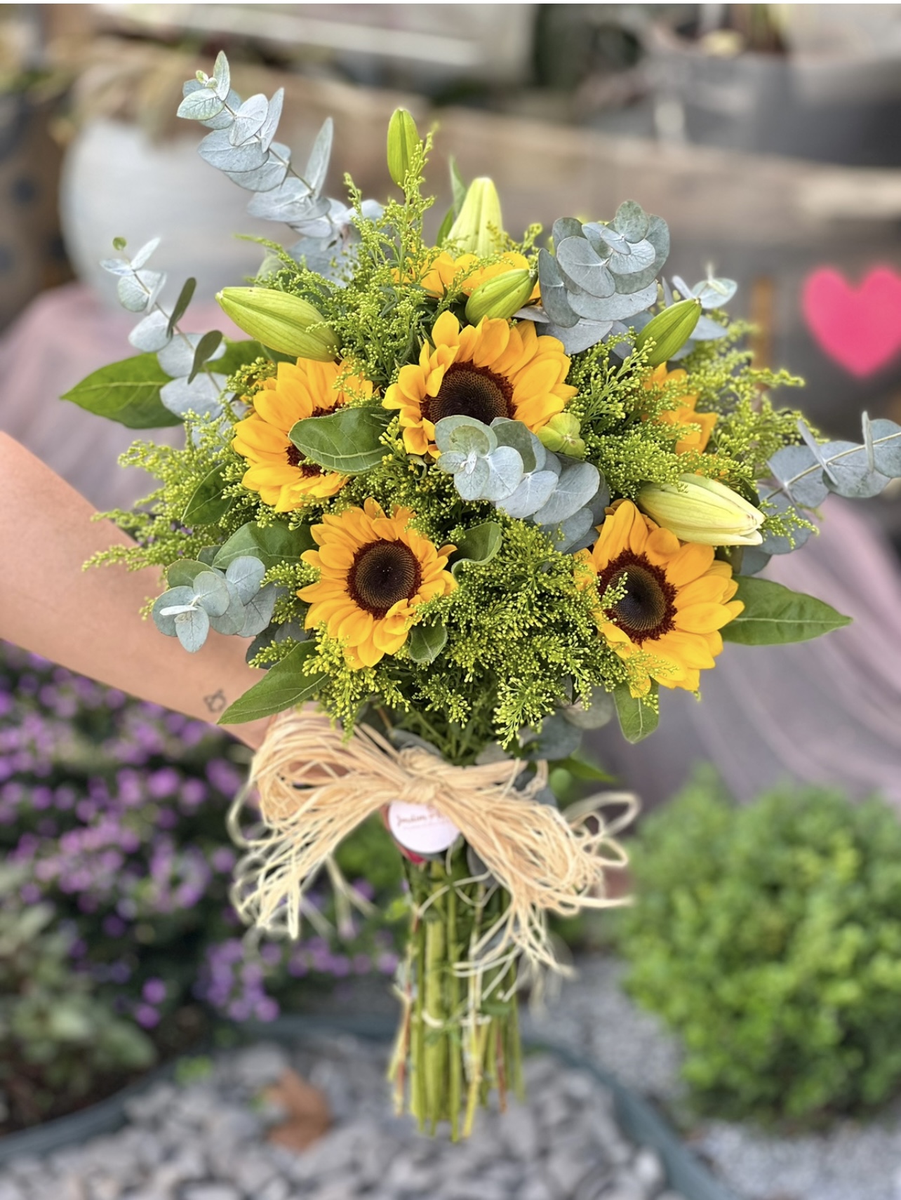 Um buquê com 10 girassóis acompanhado de lírio, tango e eucalipto. Sem papel na embalagem, somente um belo laço de raphia. ATENÇÃO: Cada buquê é único, feito de forma manual pensado para cada momento, podendo haver alteração no aspecto das flores e da embalagem.