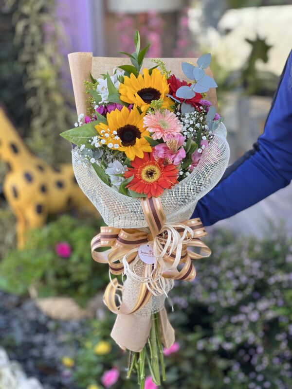 Um buquê com lirios e astroemerias em tons de rosa e branco. ATENÇÃO: Cada buquê é único, feito de forma manual pensado para cada momento, podendo haver alteração no aspecto das flores e da embalagem.