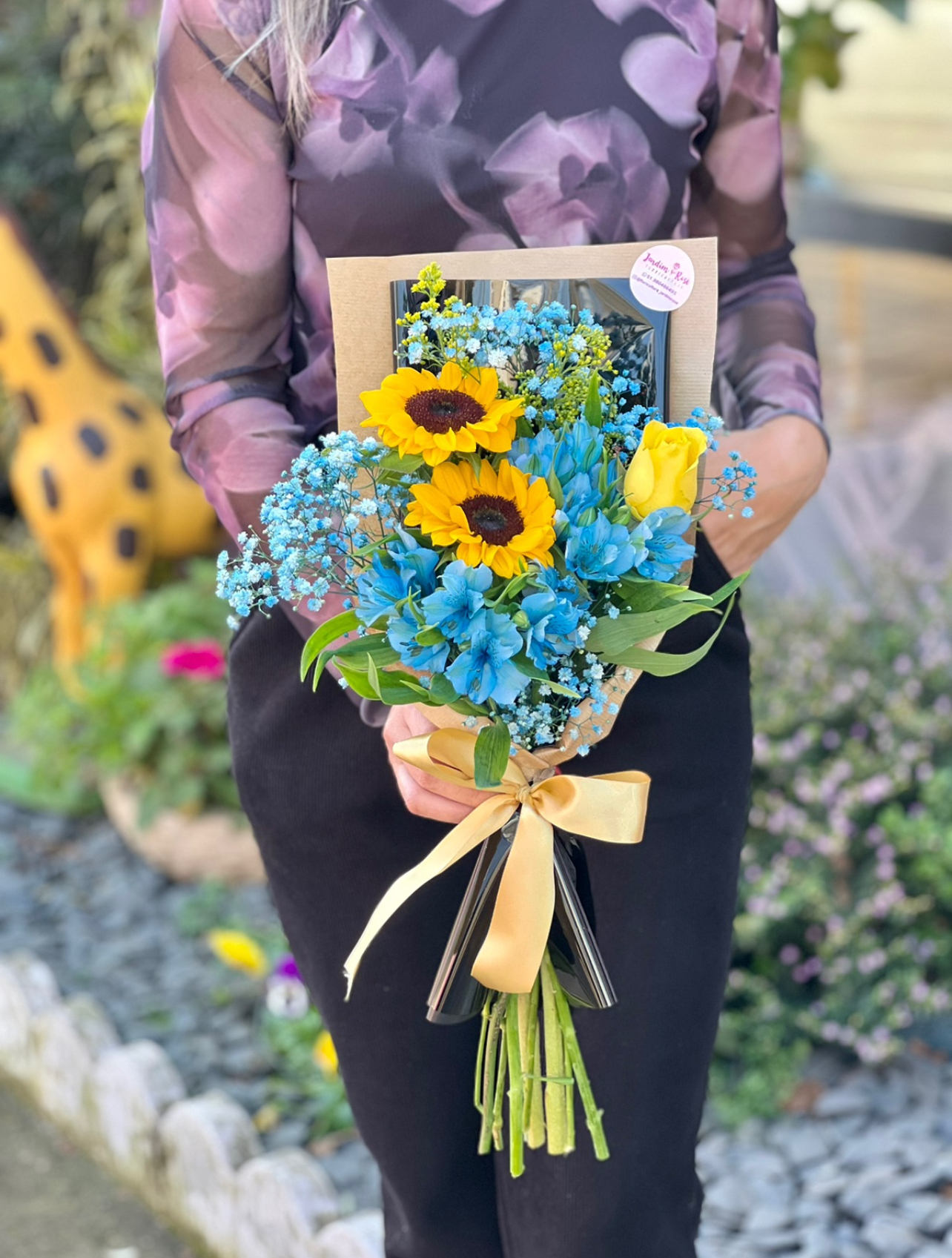 Um buquê inspirado na obra de Van gogh, com dois girassóis e uma rosa amarela acompanhados de flores azuis. ATENÇÃO: Cada buquê é único, feito de forma manual pensado para cada momento, podendo haver alteração no aspecto das flores e da embalagem.