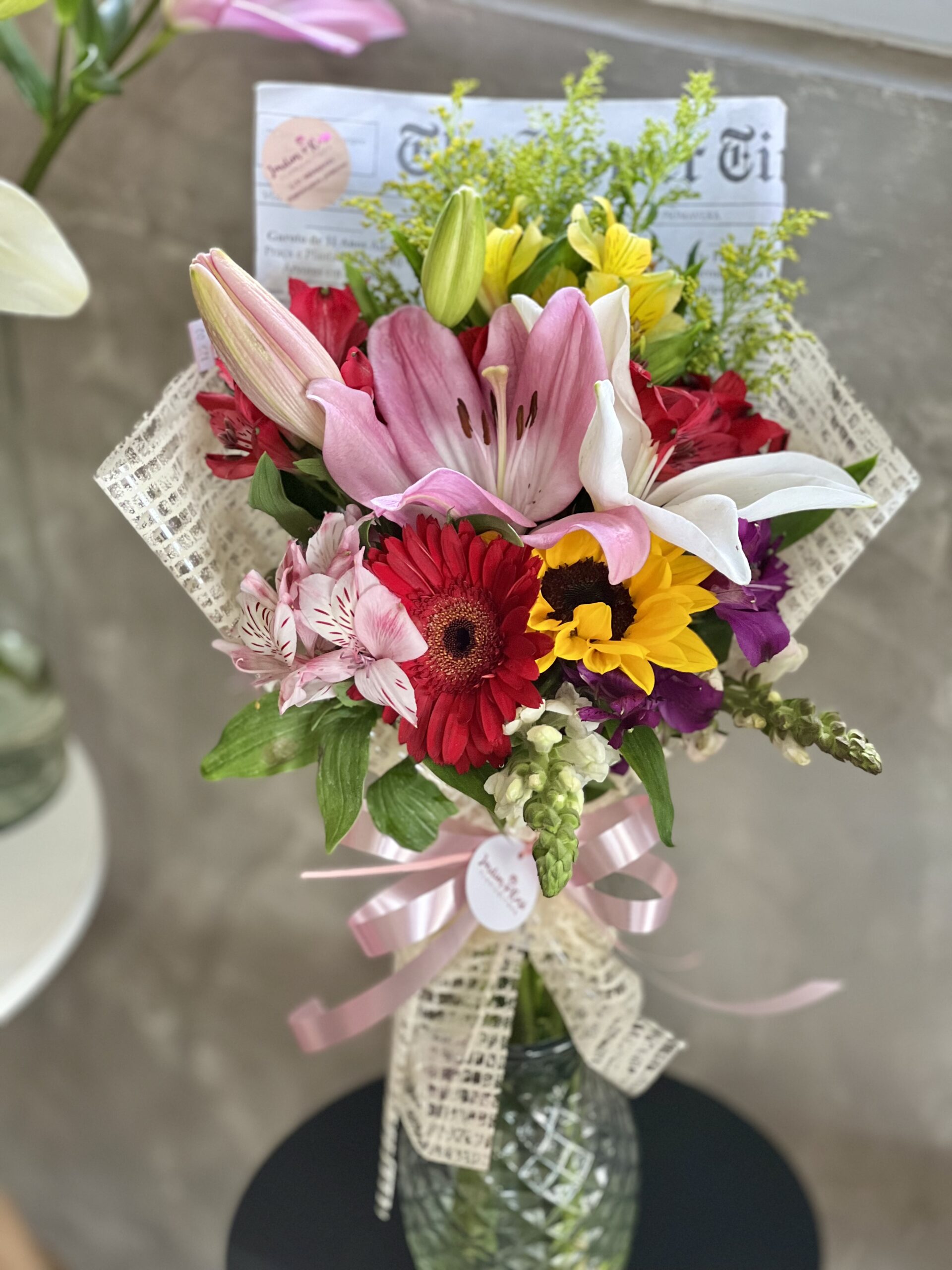 Um buquê delicado, colorido, com flores diversas em uma embalagem alegre. ATENÇÃO: Cada buquê é único, feito de forma manual pensado para cada momento, podendo haver alteração no aspecto das flores e da embalagem.