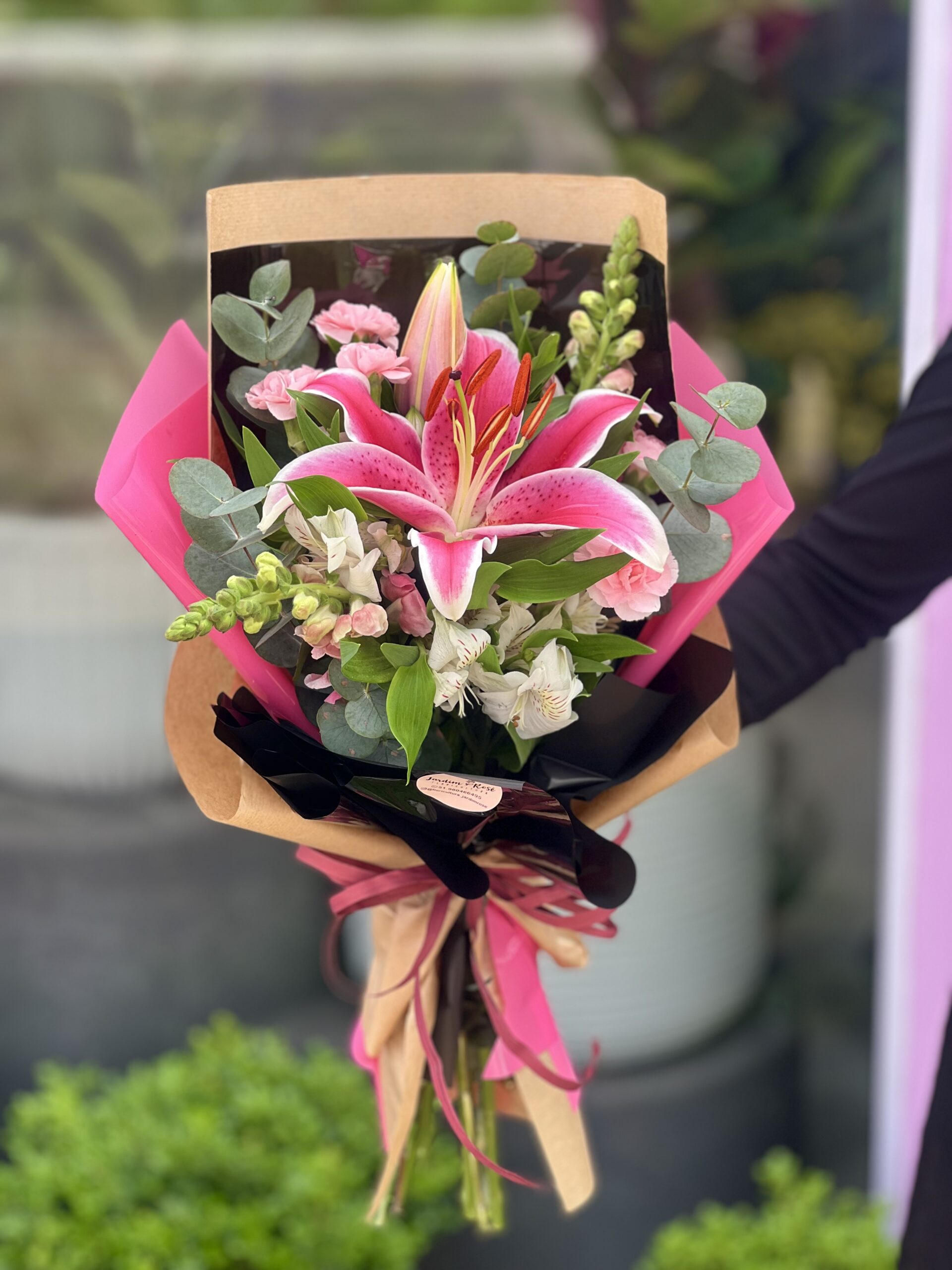 Um buquê com lírio rosa como flor principal acompanhado de flores mistas e delicadas. ATENÇÃO: Cada buquê é único, feito de forma manual pensado para cada momento, podendo haver alteração no aspecto das flores e da embalagem.