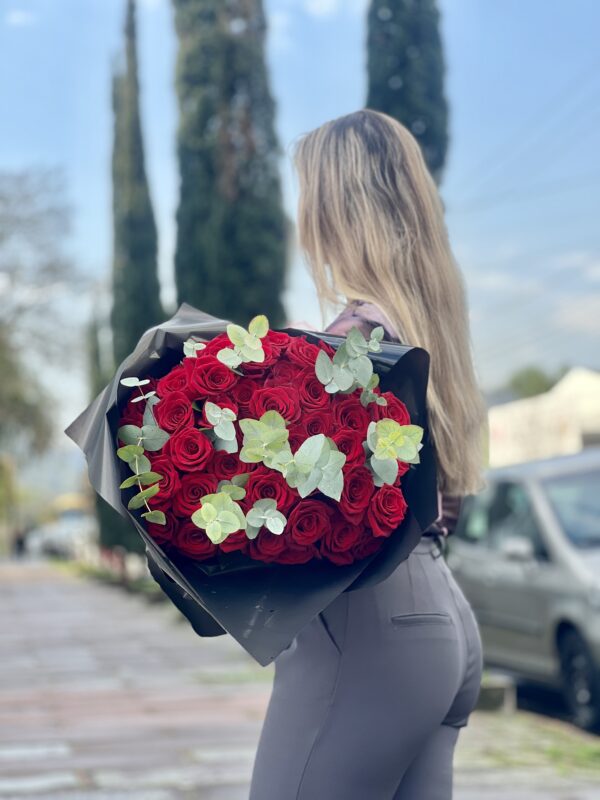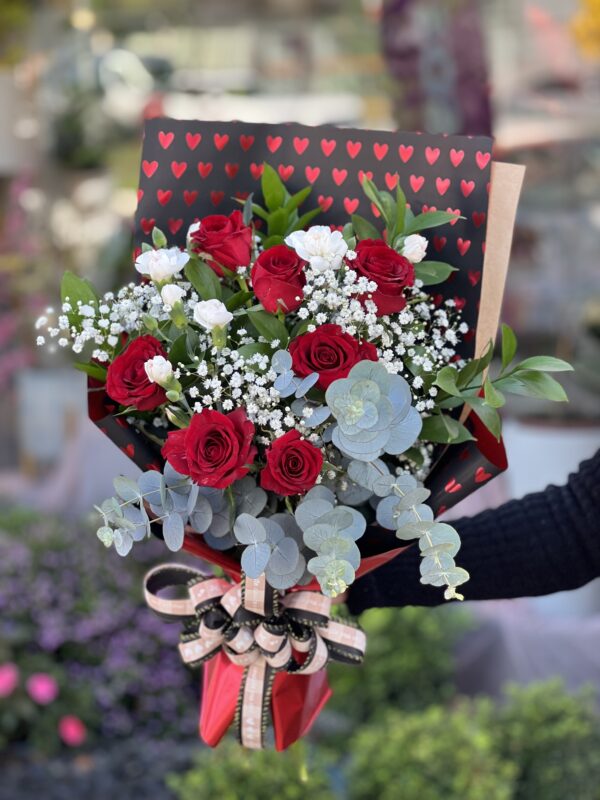 Um buquê com 5 rosas vermelhas importadas acompanhadas de ruscos e eucalipto. ATENÇÃO: Cada buquê é único, feito de forma manual pensado para cada momento, podendo haver alteração no aspecto das flores e da embalagem.