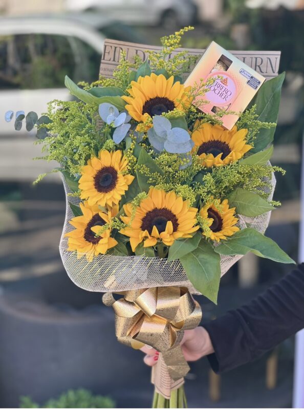 Um buquê com três girassóis acompanhados de tango e eucalipto em uma embalagem neutra. ATENÇÃO: Cada buquê é único, feito de forma manual pensado para cada momento, podendo haver alteração no aspecto das flores e da embalagem.