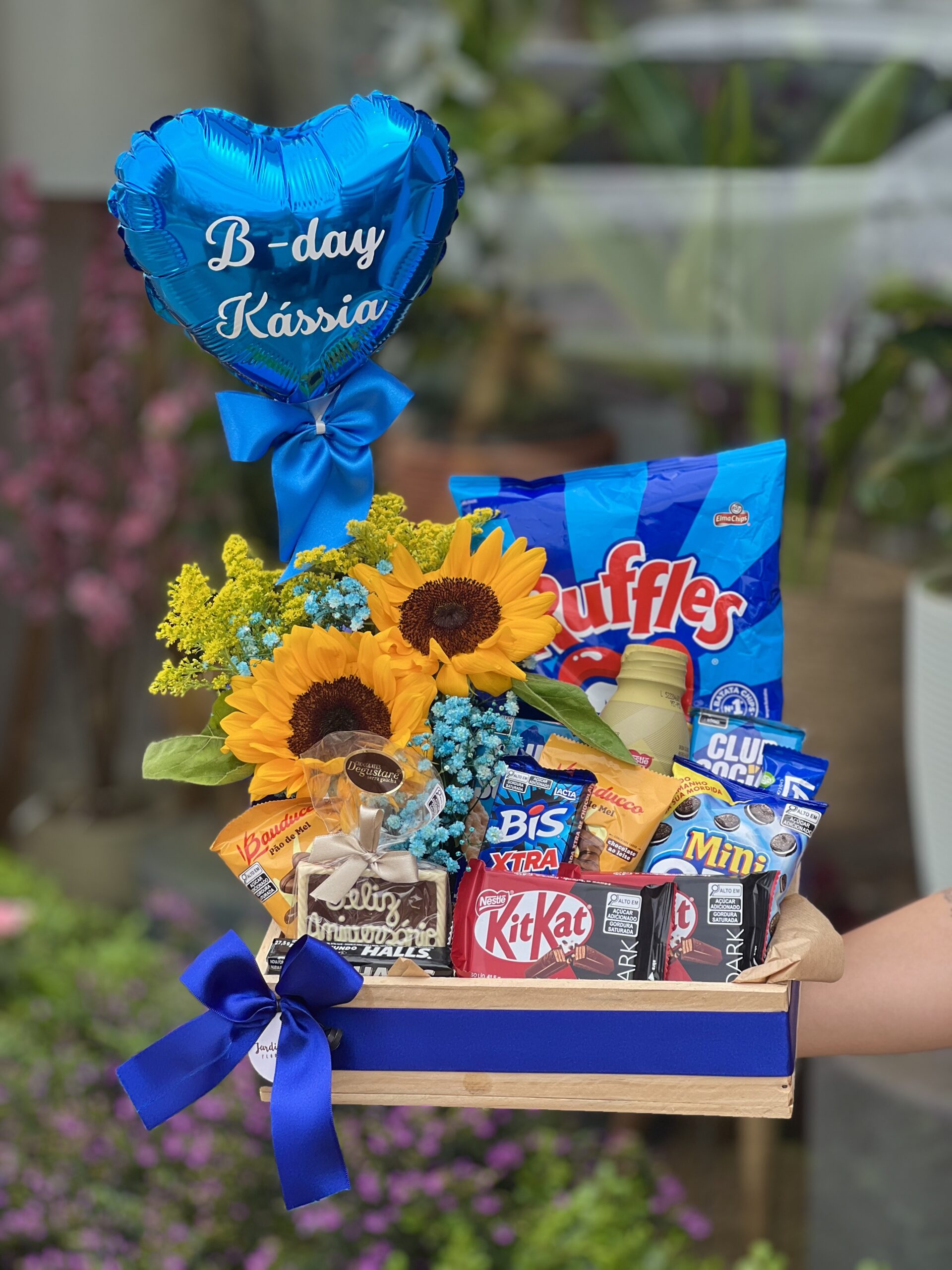 Cesta de madeira. Após a compra entramos em contato para solicitar a frase do balão. É possível solicitar uma cor diferente para decoração. Flores naturais acompanham a cesta