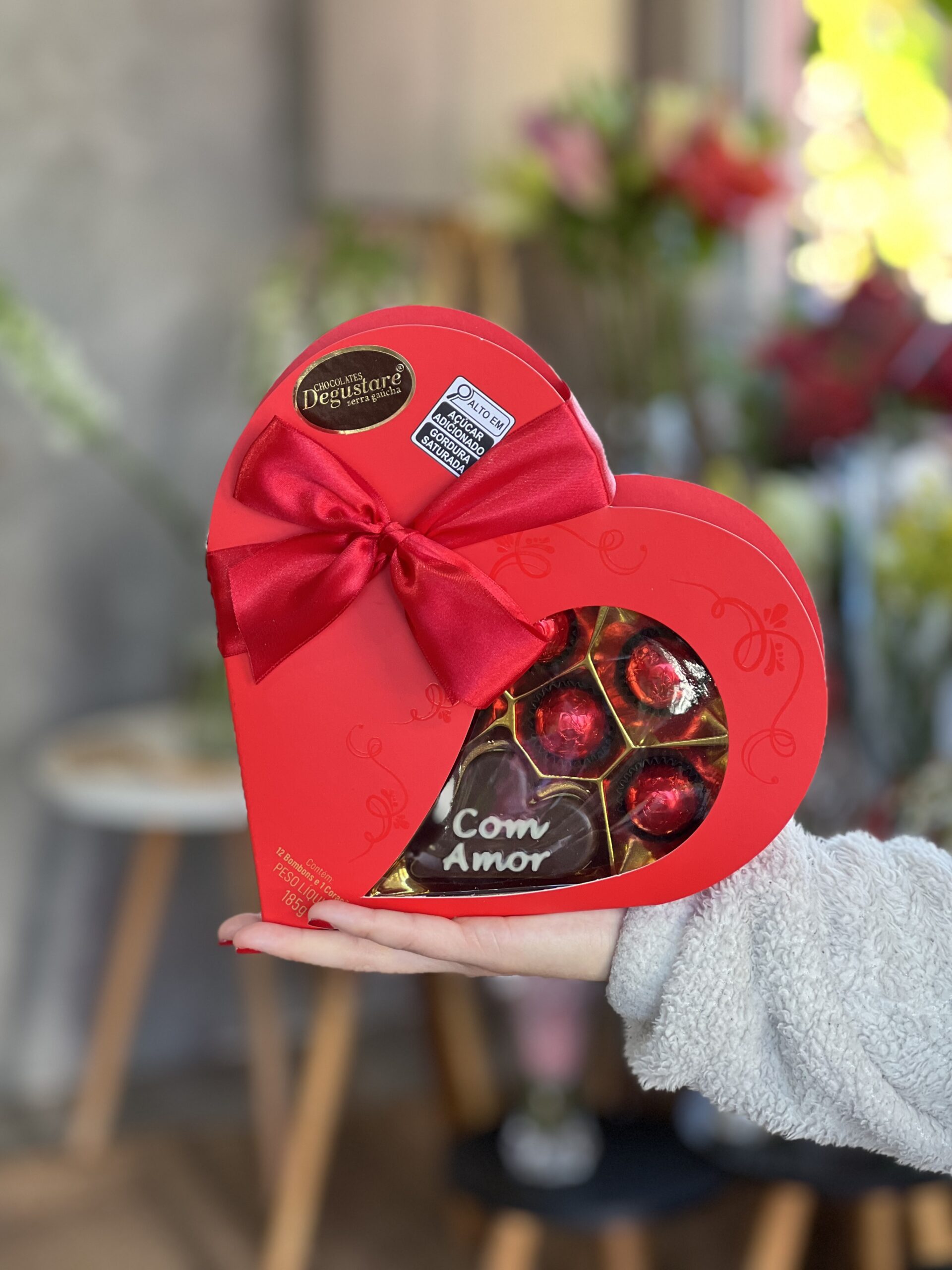 Um conjunto de trufas de chocolate em uma embalagem de coração personalizado com o dizer Com amor.