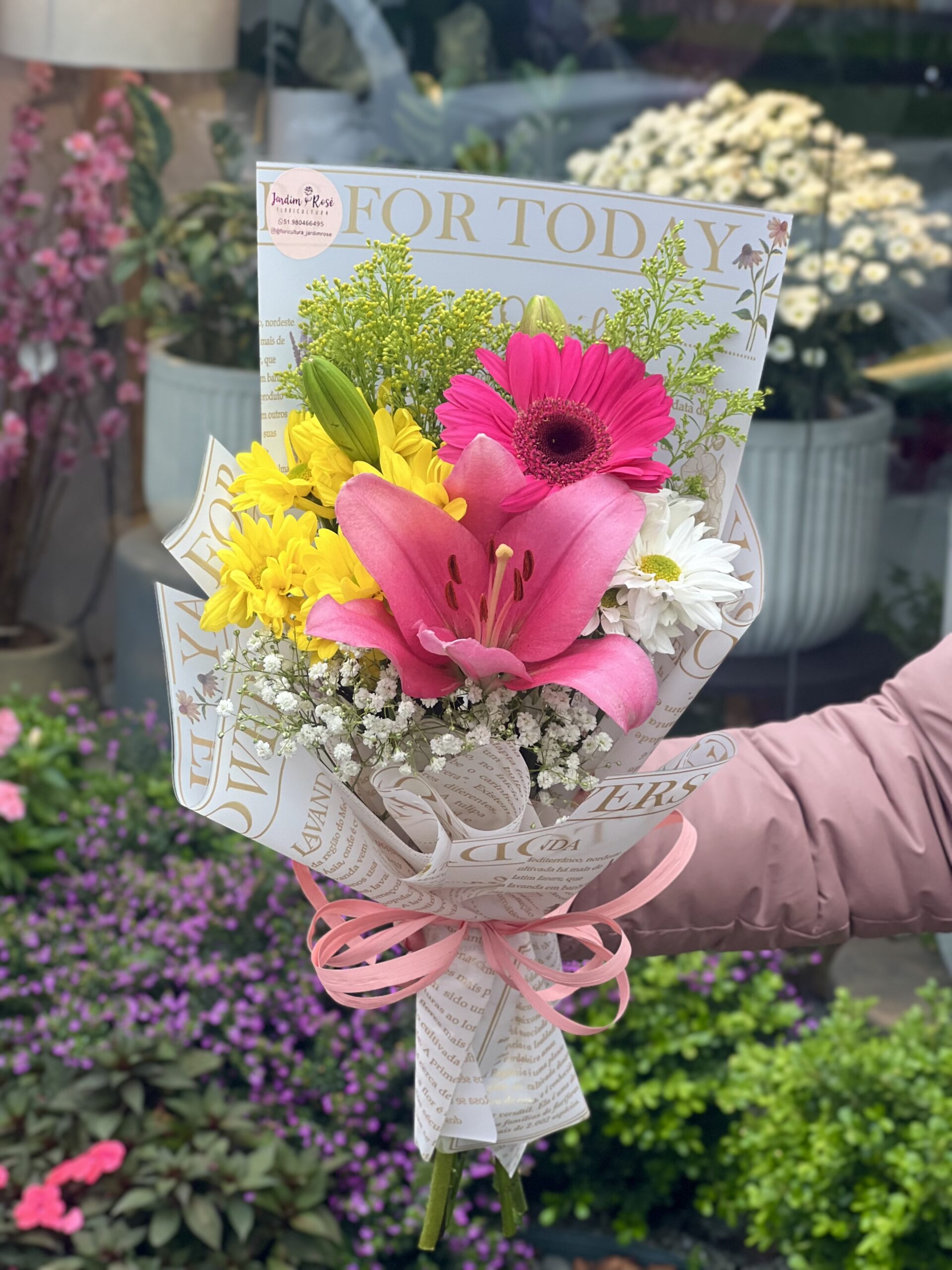 Um buquê de flores sortidas com destaque para o lírio rosa.