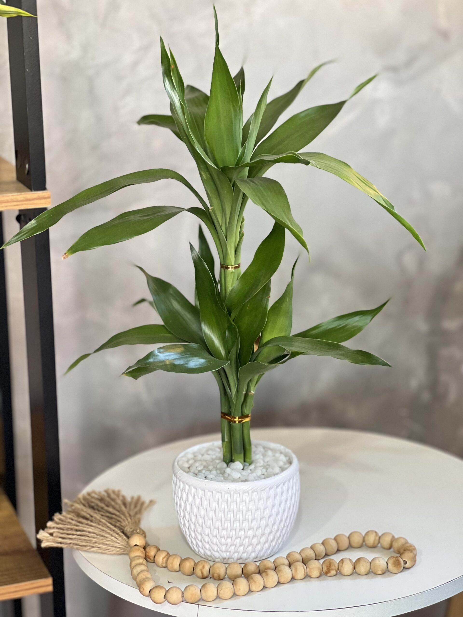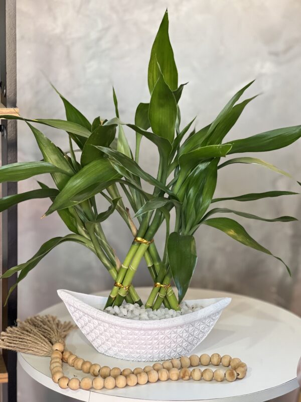 Um bamboo da sorte de agua com hastes retas e cachepo de polietileno branco.