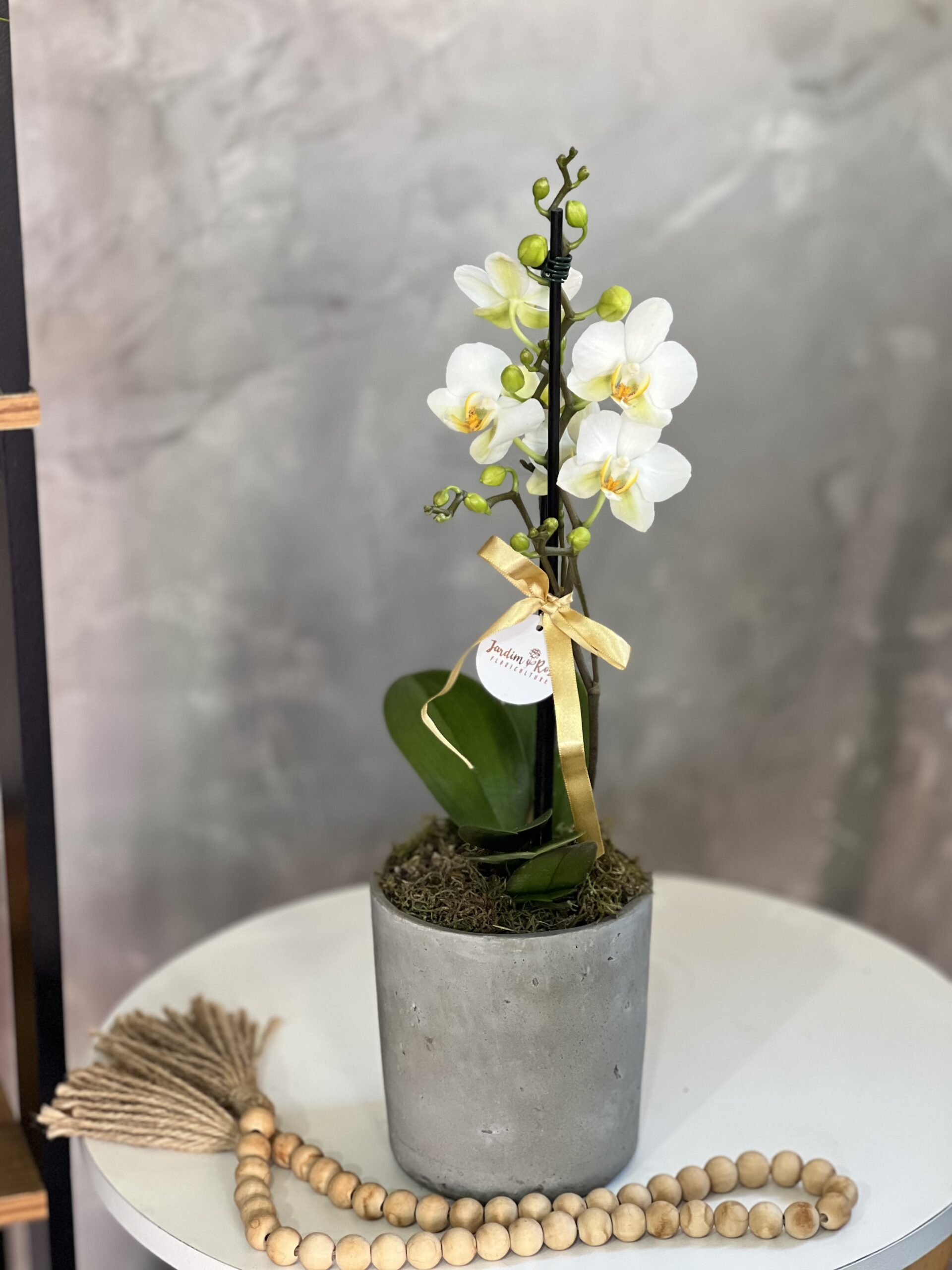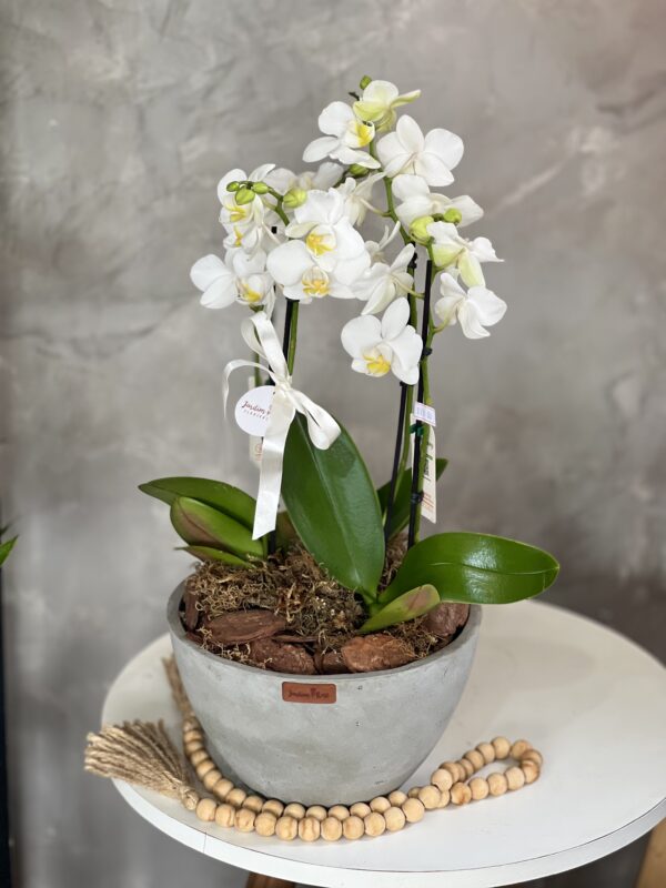 Uma mini orquidea pote 12 branca em cachepo cimenticio