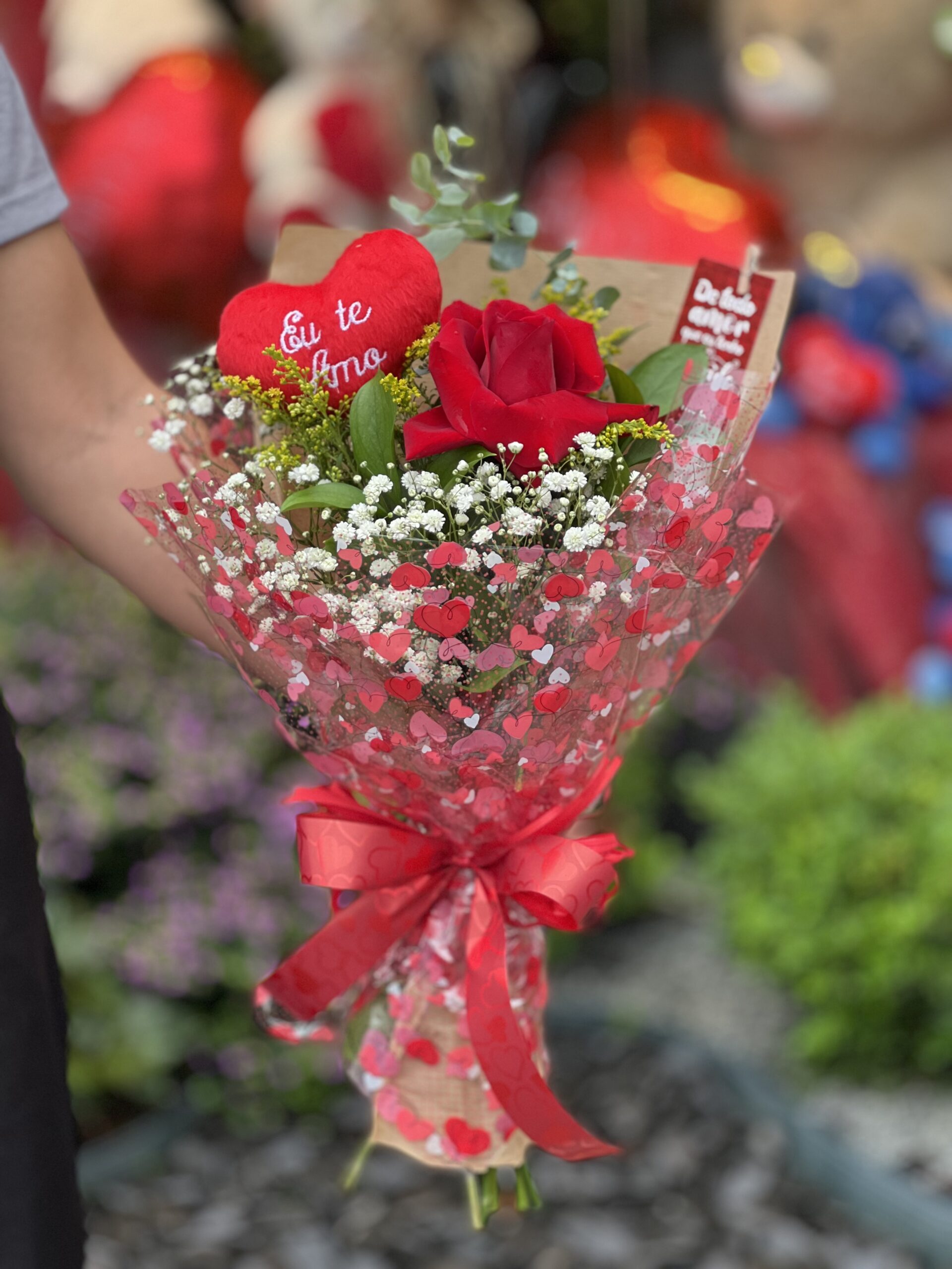 Um buquê com uma rosa decorada acompanhada de eucalipto, ruscos, mosquitinho e pelúcia de coração. ATENÇÃO: Cada buquê é único, feito de forma manual pensado para cada momento, podendo haver alteração no aspecto das flores e da embalagem.